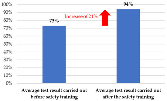 2. Learning—In the second stage of the survey, the results of the initial test and the final exam were compared to determine the level of increase in knowledge. In addition, participants were asked to provide candid comments regarding their feelings after receiving the training. Figure 7 shows the average of the pre-training and post-training workplace safety knowledge test scores. It is worth noting that the knowledge of the employees on workplace safety where the study was conducted is at a high level. After the training, the level of knowledge among employees increased by 21 percent.