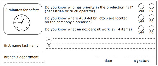 3. Behavior—The third stage of the survey refers to the changes that occur in the employee’s behavior. This change is related to the employee’s awareness of their knowledge and the form of compensation (mobilization). The behavioral changes of the trainees were verified by conducting moderated conversations on the topic of job security between the supervisor and the subordinates. These meetings are called “5 min for safety” and were held at each work shift once a week, during which employees had the opportunity to discuss problems occurring during work tasks using a brainstorming technique that stimulates creative thinking. Employees in team groups develop ways to solve problems and then the best solution is selected. At the end of the meeting, each worker received a questionnaire with several questions about safe work. An example of this type of questionnaire is shown in Figure 8. Each week, employees answered different questions, and if a subordinate was unsure or unaware of a particular topic, the manager conducted a follow-up interview immediately after completing the questionnaire.