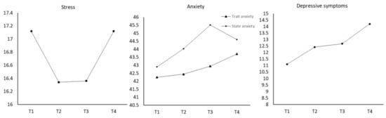 From Figure 1 and Table 2, stress levels decreased from T1 to T2 and T3 and then increased at T4. However, when compared with T1, the change at T2 was statistically significant. In addition, since the mean score of the PSS at T1 and T4 was extremely close, we inferred that stress at T4 was significantly higher than it was at T2. Trait anxiety increased from T1 to T4; yet, those changes were not statistically significant. State anxiety increased throughout pregnancy and decreased at postpartum. Levels of state anxiety at T3 were significantly higher than that at T1. Levels of depressive symptoms increased along the time from T1 to T4, and the level at T3 and T4 was significantly higher than that at T1.