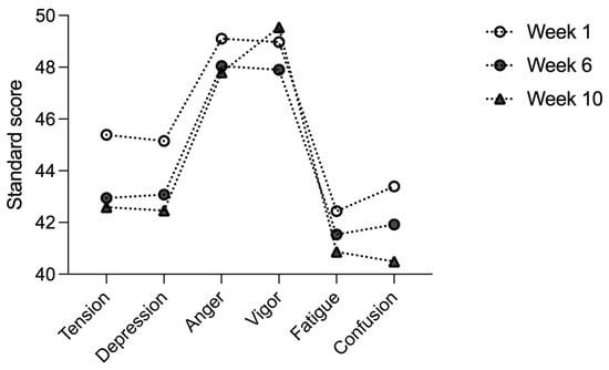 The tension factor showed significant differences in the overall analysis, while the values obtained were lower than those provided by other research (10.21 ± 5.56 AU vs. 12.94 ± 6.228) []. The significant differences in the depression factor between week 1 and 10, when the values decreased, could be due to the positive effect of the athletes returning to training and being able to interact again with their coaches and teammates [].
