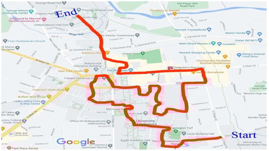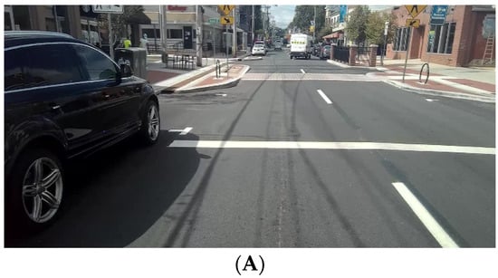 All videos were collected by one investigator (RRS—observer) over a seven-week period on one weekday per week between 17 August and 28 September 2020. The weekday for pilot and baseline data collection was randomly selected (Monday was selected) and occurred prior to the start of the fall semester. The weekdays for the remaining data collections days were Tuesday (week 3) through Friday and Monday (week 7). Observations for all data collection days started from the same beginning point at 11:15 am and ended at the same stop point between 12:15 and 12:19 pm. The observer traversed the observation route on a bicycle while recording videos with the WVD. Videos were obtained for 10 s at each node from the same position each observation day with the observer motionless. Videos also were captured continuously by the observer while moving from one node to another traveling only on campus walkways and residential/business area streets. Video footage obtained during inter-node travel contained the entire breadth of the campus walkways or streets including the sidewalks on either side. For people orientated in the same direction as the observer, the observer turned his head in order to obtain video of their face. Otherwise, the observer kept his head, and thus camera, focused on the relevant area of the inter-node route. These procedures helped video reviewers limit descriptions of people to specific route areas. See Figure 4 for images showing inter-node, street/sidewalk view with two people orientated in the same direction as observer (upper left of Figure 4A) and the same inter-node, street/sidewalk (Figure 4B) with side video capture of the facial areas of the two people seen in Figure 4A (one with mask on forehead and other with mask around neck). No precipitation fell on any of the observation days, the temperature (77.7 ± 6.3, range 69.0–87.0 °F), humidity (65.1 ± 4.8, range 57.0–71.0%) and wind speed (8.6 ± 2.8, range 5.0–12.0 mph) were typical for the area during the times data were collected [].