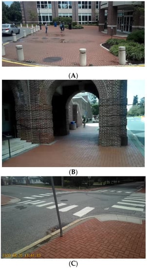 Videos were collected along a 4.69 mi pre-determined route that coursed through the University of Delaware campus (60% of route) and adjacent business and residential areas (40% of route) (Figure 2). The route was constructed to connect 79 nodes which represented areas normally associated with high volumes of pedestrian traffic [entrances/exits of academic buildings, entrances/exits of dormitories, dining halls, recreational and student facilities (Figure 3A); campus walkway pinch points (area where walkway is narrowed by obstruction) (Figure 3B); sidewalks; crosswalks (Figure 3C) and public open spaces (Figure 3D)]. The route between notes consisted of campus walkways and residential and business area sidewalks/streets.