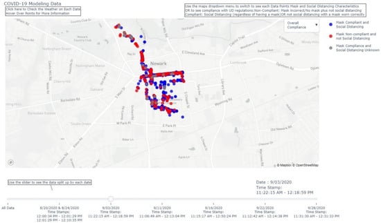 The VT-scan was useful for describing COVID-19-related factors as well as their interactions with each other. Further, the sensitivity of VT-scan was exemplified in the time fluctuations noted over the course of case study observations. During the case study, a State of Emergency was in effect that mandated mask wearing and physical distancing in indoor and outdoor areas with any failure to comply constituting a criminal offence. However, these rules were not enforced until week six of the case study and at that point, VT-scan noted a substantial rise in mask/physical distancing adherence. Of importance was the findings on the variation in COVID-19 transmission behaviors by personal and environmental factors. This is consistent with previous research on variations in infections and transmission behaviors across study sample characteristics []. However, the findings are also novel in the sense that VT-scan provides a more localized picture (smaller geographical scale) of these phenomena. In addition, VT-scan might afford a look at more nuanced deviations that arise because the data are better representative of a smaller-scale or a more defined area (e.g., campus) than a larger-scale area (e.g., state). Therefore, VT-scan could be used to enhance agent-based modeling, local policy and/or interventions or campaigns aimed at reducing viral spread. Relatedly, localized anomalies relative to place may be uncovered. For example, in the case study we found lower percentages of individuals practiced both mask wearing and physical distancing when in open spaces and along campus walkways. Armed with such information, highly “tailored” prevention/mitigation efforts could be put forth—University administration could curtail traffic on campus walkways (e.g., through staggered class times) or use “point-of-decision” prompts (e.g., signs near campus open spaces encouraging mask use and physical distancing). Such interventions have been shown effective for increasing stair vs. escalator/elevator use []. Additionally, VT-scan allows for flexibility in terms of where data are collected which is not a strength of other assessment methods in this area especially those relying on surveillance cameras. Theoretically, data collection could be adjusted to capture scheduled and unscheduled (pop-up) large gatherings or uncover small-scale anomalies that could factor into transmission rates. As an example of the latter, we observed low physical distancing compliance along a retail business corridor adjacent to campus. It is possible that University student COVID-19 risk/rates are enhanced because they utilize this business area, but such utilization is not accounted for in University COVID-19 prevention policies or interventions thus potentially reducing their effectiveness.