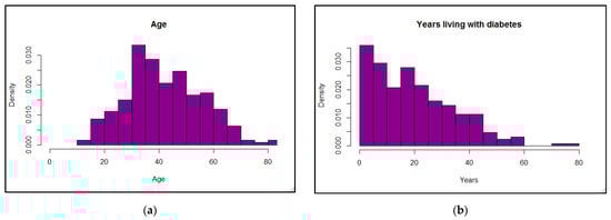Distribution of participants by age (a) and years living with type 1 diabetes (b).