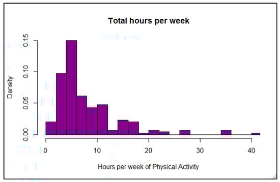 The total weekly time spent being physically active was estimated based on participant responses to both frequency (number of days per week) and usual time spent exercising on active days. The total hours per week were calculated as a product of the two, and the distribution of participant time is shown in Figure 2. The nature of the survey did not allow for any differentiation among time spent doing different types of activities.