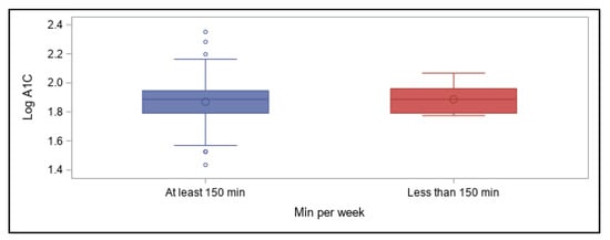 When total physical activity time per week was further categorized into whether participants’ met the recommended minimum (at least 150 min, or 2.5 h, of aerobic activity) or engaging in less than 150 min [,], total time was not significantly predictive of log A1C values regardless of whether or not participants met weekly physical activity recommendations (Figure 3). Total time, however, included all types of activities in this survey.