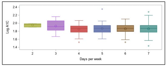 The number of days of activity per week ranged from 2 to 7 (Figure 4), demonstrating that all participants were physically active. However, frequency of physical activity was not a significant predictor of A1C.