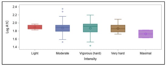 The usual intensity of physical activity engaged in by participants ranged from light to maximal, depending on the sport or activity (Figure 5). However, intensity also failed to predict differences in A1C values.