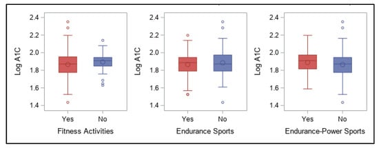 Participation in fitness activities, endurance sports, and endurance-power sports and association with log A1C values.