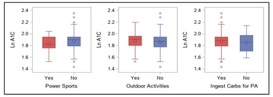 Participation in power sports and outdoor activities and ingestion of carbohydrates for physical activity and association with log A1C values.