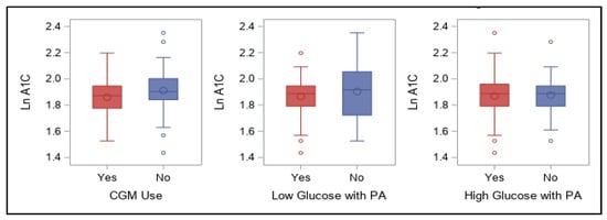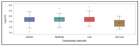 where represents the response of the ith participant’s A1C, for , with representing other predictors like biological sex, usual carbohydrate intake, use of CGM devices, and other collected variables. Predictor variables were either discrete or continuous. In the model equation, the term served as the model intercept and referred to the slope associated with the predictor variable, with the errors and with the model variance. In order to minimize variance and satisfy model assumptions, a transformation of the A1C to a natural log scale was applied.