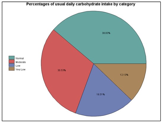 With all variables considered within our model, the only significant predictors of participants’ log A1C values ended up being their use of CGM devices (p = 0.02) and their typical carbohydrate intake (p < 0.0001). These associations remained strong when analyzing either A1C or transformed natural log A1C (analyses shown in Appendix A). However, the variance was significantly reduced when the prediction model used log A1C given the gap evident in the distribution of participants’ A1C values (see Figure A1). The overall associations between A1C and usual carbohydrate intake categories are shown in Figure 9, and the relative percentages of participants falling into each carbohydrate intake category are shown in Figure 10.