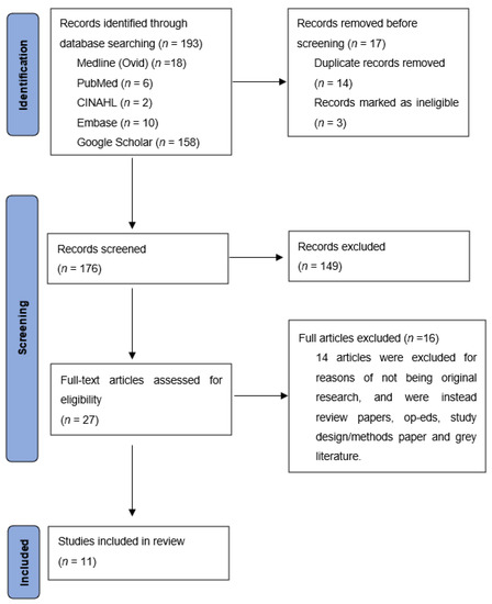 A total of 193 peer-reviewed articles were identified and screened by an Aboriginal researcher (JB). After removal of 166 articles for duplication and not meeting inclusion criteria, further screening was undertaken by TF, where 16 additional papers were excluded. Summary characteristics of the 11 included articles are presented in Figure 1 and Table 2.