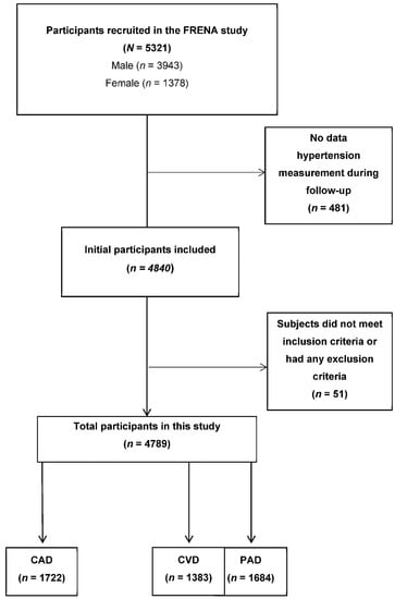 Hospitals participating in the FRENA registry prospectively recruited consecutive outpatients with medical history-based symptomatic artery disease with at minimum one recent (less than three months prior to recruitment) episode of PAD (either intermittent claudication with an ankle-brachial index (ABI) < 0.9, previous vascular intervention or limb amputation for PAD); CVD (manifesting as transient ischemic attack or ischemic stroke); or CAD (manifesting as angina or acute coronary syndrome). Subjects with intermittent claudication (ABI ≥ 1.4) were excluded. Exclusion criteria were, if they would not be available for follow-up or if they were currently participating in a clinical trial with blinded therapy. All patients gave written consent to participate in the registry, in accordance with the requirements of each hospital’s ethics committee (Hospital San Pedro de Alcántara (Ref. 14/0189), Hospital Comarcal Valle de los Pedroches (Ref. 14/0032) and Hospital Germans Trias i Pujol (Ref. 14/0524)). Figure 1 shows the participant selection process.