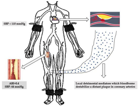 Proposed mechanism of destabilization of a coronary plaque by distal ischemia. A patient with PAD and ABI of 0.4 may have SBP leg lower of 44 mm Hg to a brachial SBP of 110 mm Hg. Local detrimental mediators, free oxygen radicals or inflammatory mediators bloodborne can produce a myocardial event by destabilize a coronary plaque. Abbreviations: ABI, ankle brachial index; SBP, systolic blood pressure.