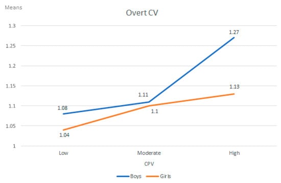 A statistically significant interaction effect was observed between CPV and sex in the overt CV variable (F (2, 1298) = 5.56, p < 0.01, ηp2 = 0.008). As can be seen in Table 4 and in Figure 1, the results of the post hoc contrast performed with the Bonferroni test (α = 0.05) indicated that the boys who presented high CPV obtained the highest scores in overt CV compared to the other groups, between which no significant differences were found.