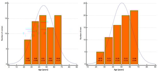 We analyzed data obtained from 140 healthy volunteers (74 men and 66 women) with a median age of 50 years (95% confidence interval (CI): 45.9–55). For women, the median age was 45 years (95% CI: 40–53) with a range from 22 to 65 years. Men were older with a median age of 54 years (95% CI: 47–57.9) and a range from 25 to 65 years. The age distribution is shown in Figure 2. The mean elasticity of all measurements was 10.67 ± 1.77 kPa. The values of stiffness by sex and side of the body are presented in Table 1. Figure 3 shows typical SWE images.