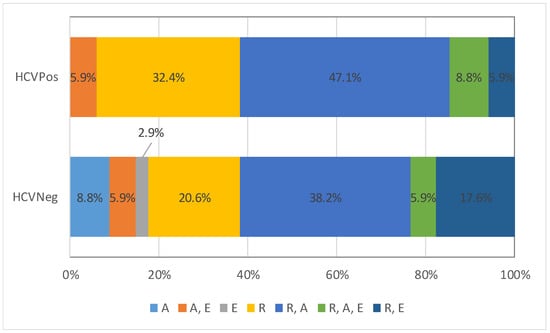 Type of lesions in OLP group: differences between those with and without HCV (A = Atrophic, E = Erosive, R = Reticular).
