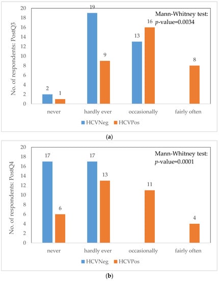The comparison within the OLP among those HCVPos and HCVNeg identified several significant differences regarding the scores for individual questions of the OHIP-14 as presented in Figure 2.