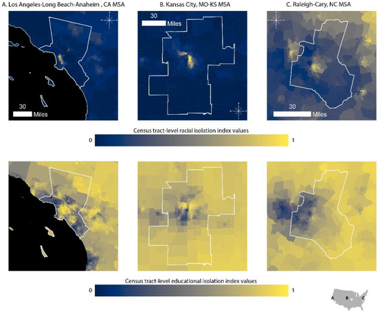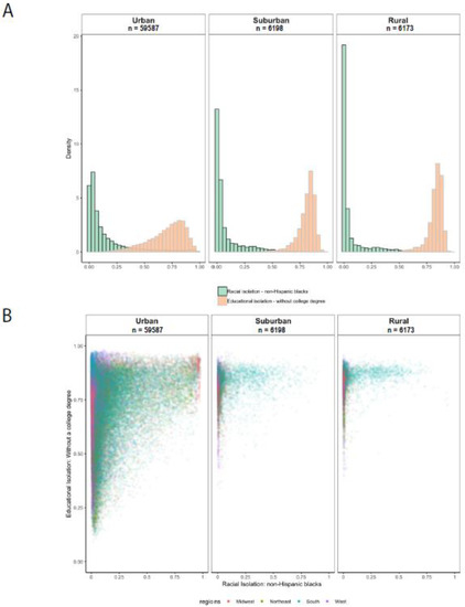 Racial residential segregation, and racial isolation as a measure of segregation, has been linked to health [1,4,6,7,8]; although the measure of EI that we introduce here is new, educational attainment is associated with poverty, employment, and income, all of which are unequivocally linked with health [56,57]. Increasingly, the United States is segregated by income [58] and race [11]. A premise of this work is that place-based exposures, including EI and RI, may underlie health and health disparities, and should both be considered and evaluated as possible adverse exposures. A key takeaway of this research is that RI and EI do not exhibit a uniform or random relationship across the United States; rather, we see differences in the relationship between RI and EI across geographic space and urbanicity levels. Specifically, in the south, we observe census tracts that are educationally isolated, racially isolated, and non-urban; elsewhere in the US, tracts that are educationally and racially isolated are found only in urban areas. For example, the health disparities and poor health outcomes that have been documented in the “Stroke Belt” [59] could relate to multiple-jeopardy situations in which adverse exposures (racial isolation, educational isolation, rurality, pollution, access to health care, among others) accumulate to specific populations, by virtue of exposures sustained, in part, due to where they live.