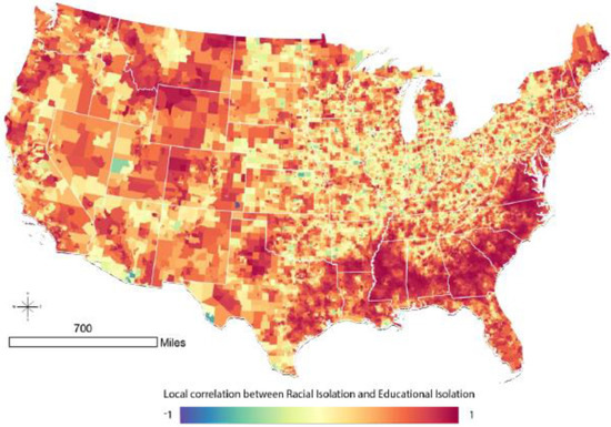 To understand the relationship between EI and RI at the local level, we calculate and map tract-level local correlation coefficients for census tracts across the continental US (Figure 4). In much of the Deep South, and extending into non-Appalachian areas of North Carolina and Virginia, there is a strong correlation between RI and EI. The South has many tracts with high levels of RI (Figure 1, Panel B), and the patterning of local correlation in Figure 4 indicates that many of the highly racially isolated tracts in the south are also educationally isolated.