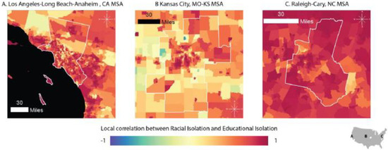 Census-tract level local correlation between racial isolation and educational isolation in three MSAs: Los Angeles–Long Beach–Anaheim (Panel A); Kansas City (Panel B); and Raleigh–Cary (Panel C). Each MSA is projected to the appropriate projected coordinate system for its location in space, specifically: Panel A: NAD 1983 State Plane California V FIPS 0405 Feet; Panel B: North American Datum (NAD) 1983 Universal Transverse Mercator (UTM) Zone 14N; Panel C: NAD 1983 State Plane North Carolina FIPS 3200 Feet.