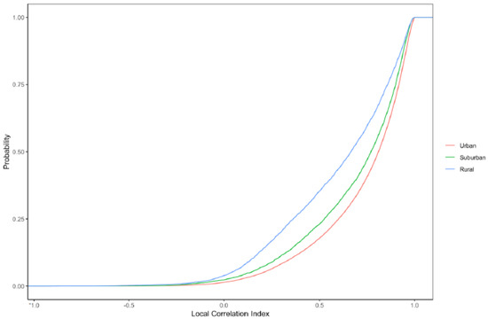 Cumulative distribution functions of the local correlation coefficient between RI and EI in urban, suburban, and rural census tracts.