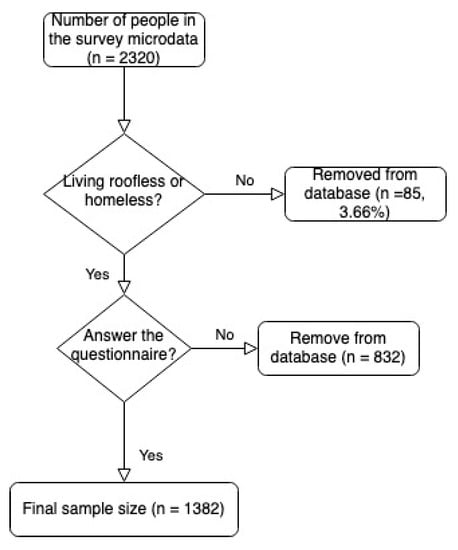 The total number of people who were identified in the original study were 2320 individuals (see Figure 1). However, for the purposes of this research, two decisions were made. In the first step, only people in the first two ETHOS categories that define homelessness (roofless and houseless) were selected (n = 2235). In the second step, people who answered the entire survey were considered. That is, from the 2235 persons who were in roofless and houseless categories, only 1382 decided to participate in the survey, so 832 people did not want to answer the entire survey and only general information on very few variables about them was collected. For this reason, there was no missing data because the 1382 people who decided to be fully interviewed answered all the questions of the survey. In short, the final sample selected for this paper consisted of 1382 homeless, where 1046 were male (75.69%) and 336 were female (24.31%).