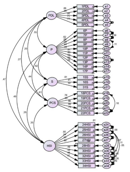 In this study, the second option was chosen. Several MIs that exceeded the specified limit were identified. The first part involved the correlation analyses of e33–e28 (47.016), e33–e34 (39.219), e32–e28 (30.206), e32–e34 (18.462), e32–e33 (69.393), e30–e28 (52.045), e30–e34 (30.413), e30–e33 (83.615), e30–e32 (43.664), e26–e27 (59.785), e25–e33 (15.919), e25–e32 (19.123), e25–e30 (16.650), e24–e26 (15.056), e24–e25 (17.015), e21–e22 (57.360), e18–e22 (15.921), e12–e13 (23.165), e8–e10 (16.040), e7–e8 (36.026), e6–e8 (38.156), e6–e7 (71.234) and e4–e5 (40.905). Then, the analysis was repeated. The final result indicates that none of the errors was correlated, except for e17–e16 (15.028) and e13–e25 (17.398); however, the errors could be attributed to the different domains.
