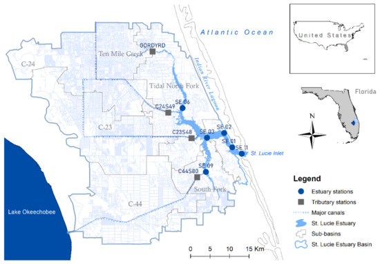 Physicochemical data for 20 years (November 1999–October 2019) from ten water monitoring stations were also obtained from the SFWMD’s publicly available repository DBHYDRO [46]. The monitoring stations were selected based on data continuity over the 20 years and their distribution throughout the basin. Stations named C23S48, C24S49, GORDYRD, and C44S80 (Figure 1) by the SFWMD represent the freshwater tributaries C-23, C-24, Ten Mile Creek, and C-44, respectively. Stations C23S48, C24S49, and GORDYRD are on canals that drain from within the basin of the estuary, while station C44S80 is downstream of Lake Okeechobee. Stations named by the SFWMD as SE 01, SE 02, SE 03, SE 06, SE 09, and SE 11 are in different regions of the St. Lucie Estuary (Figure 1). Station SE 06 is in the North Fork, SE 09 is in the South Fork, SE 02 and SE 03 are in the Mid-Estuary, and SE 01 and SE 11 are in the Lower Estuary (Table 1).