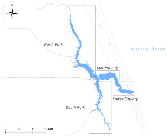The St. Lucie Estuary has four main geographical sections: the North Fork, the South Fork, the Mid-Estuary, and the Lower Estuary (Figure 2), where salinity has intra-annual fluctuations. Salinity patterns affect productivity, population distribution, community composition, and food web structure in the estuary. In shallow and highly managed estuaries, such as the St. Lucie Estuary, salinity is driven mainly by hydrologic events and water management practices and can range from <1 to >35 parts per thousand [38,39]. Vertical stratification generally happens during large water releases from Lake Okeechobee. The Lower Estuary, the area closest to the ocean inlet, generally has the highest median salinity and the lowest salinity values are in the North and South Forks, which are furthest from the ocean inlet [40].