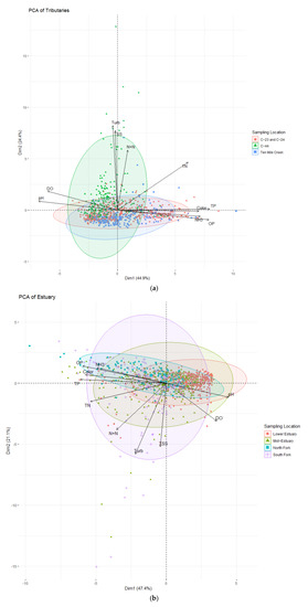 The PCA biplots (Figure 3a,b) display the transformed data on the first two dimensions. The scree plots showed the percentage of variance accounted for by each dimension (Figure 4) and the loadings to each of the dimensions are shown in Table 4. The variables with more weight on the dimension were depicted with longer arrows than those with less weight on the biplots. Small angles between vectors represented a positive correlation, while those close to 180° were negatively correlated. The scree plots (Figure 4) showed that the first three dimensions of the tributaries accounted for 79.3% of the total variance, and the first three dimensions of the estuary accounted for 76.8%. However, for general characterization purposes, the first two dimensions were examined in more detail because they explained close to 70% of the variance, and the eigenvalue of dimension 3 was lower than 1 for both the tributaries and estuary samples.