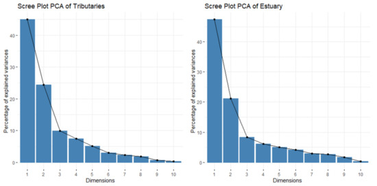 The scree plots of the PCA of samples from the tributaries (left) and those from the estuary (right) indicate the percent variance explained by each dimension.