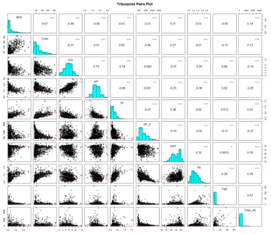 The correlation and trend tests performed were selected based on the nonparametric nature of the datasets. The strength of monotonic correlations between the physicochemical variables and flow was measured using Kendall’s tau correlation coefficient (τ). The R script for the pair plots was modified from Ryberg (2017) [59]. The Kendall’s tau correlation and significance were assessed for the physicochemical variables from tributary samples. Only tributary samples were chosen because they presented stronger associations in the PCA than samples from the estuary and greater applicability in water management as these inputs are important drivers of the estuary’s water quality. NH3, color, DO, pH, TP, specific conductivity, SWT, TN, turbidity, and flow were assessed for the 20 years.
