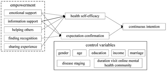To bridge the gap in existing research, to address the limitations of previous studies and to answer the proposed research questions, we developed the model shown in Figure 1. With the health self-efficacy theory and the expectation confirmation theory as the theoretical basis of the model, the various processes of empowerment have a major role. Control variables included gender, age, education, income, marriage, disease staging, and duration of visit to online mental health communities.