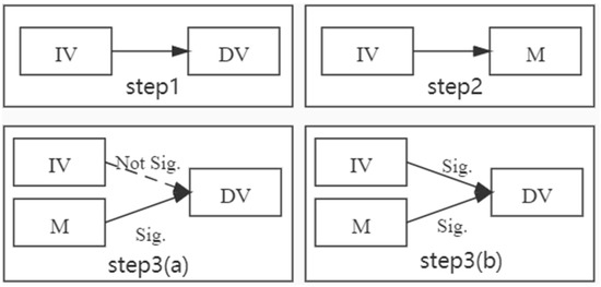 This paper used the method proposed by Baron and Kenny [72] to examine mediating effects. This method has three steps. The first step is the regression of the dependent variable to the independent variable (IV→DV). The second step is the regression of the independent variable (IV→M) with the intermediate variable. In the third step, the dependent variable regresses the intermediate variable and the independent variable (IV + M→DV). In step 3, if M is significant but IV is not, then M completely mediates the effect of IV on DV. If both M and IV are significant, M partially mediates the effect of IV on DV. The mediation test method is shown in Figure 2.