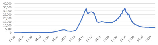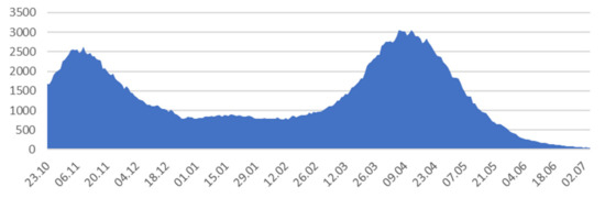 The largest number of deaths (COVID-19) during the first wave was on 11 November 2020 (90 deaths) and during the second wave was on 13 April (110 deaths). At present (22 July 2021) data show a significant reduction in the number of newly diagnosed cases (Figure 3).