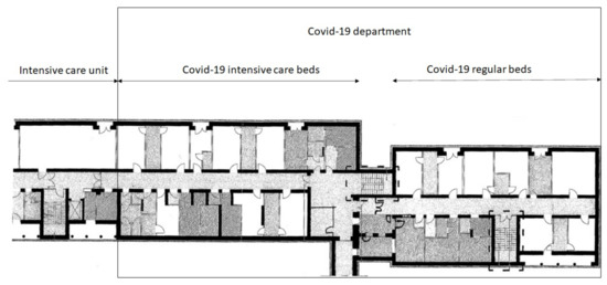 - Auerbach, A.; O’Leary, K.J.; Greysen, S.R.; Harrison, J.D.; Kripalani, S.; Ruhnke, G.W.; Vasilevskis, E.E.; Maselli, J.; Fang, M.C.; Herzig, S.J.; et al. Hospital Ward Adaptation During the COVID-19 Pandemic: A National Survey of Academic Medical Centers. J. Hosp. Med. 2020, 8, 483–488. [Google Scholar] [CrossRef] [PubMed]