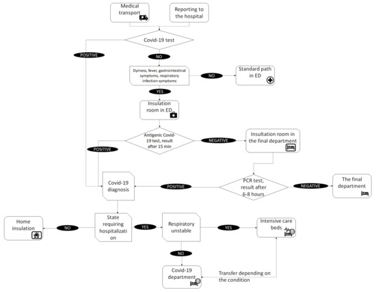 In the case of symptomatic patients without a test result, the first stage of the procedure took place in the Emergency Department, in which an interview was conducted and an antigen test performed. During the examination and while waiting for the result, the patient was kept in an isolation room. The test result was obtained after 15 min. In the case of a positive result, the patient fell into the same path as patients positive at admission. Their further treatment depended on the condition. If the antigen test was negative, a PCR test was conducted for the presence of SARS-CoV-2 virus. While waiting for the test result, the patients stayed in an isolation room either in the ED or in the target department, especially if they required immediate specialist treatment. After receiving the PCR test result, the patient either remained in the target department in a general room if the result was negative and the condition required it, or went to the infectious department.