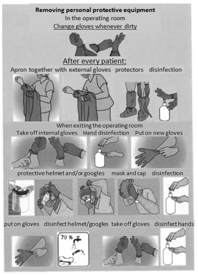 Basic personal protective equipment included barrier aprons with long sleeves, caps, disposable gloves (in the amount of two pairs put on top of each other), masks (surgical or protective type FFP2/FFP3 for aerosol-generating procedures), protective glasses or a protective helmet.