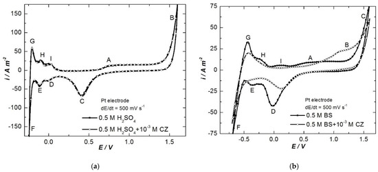 Analyzing the curves from Figure 2a, it is observed that in strong acid media (H2SO4), CZ does not undergo electrochemical reactions at either the anode or cathode. At high scan rate, peaks and waves assigned to the superficial oxidation of platinum substrate A (about +0.75 V) and oxygen evolution B (about +1.50 V) can be distinguished (at anodic polarization), as well as its reduction peak C (approx. +0.40 V), followed by the generation of adsorbed hydrogen atoms (Hads) D (about 0 V), adsorbed hydrogen molecules (H2ads) E (approx. −0.15 V), and H2 evolution F (about −0.25 V), and their oxidation correspondents (G, H, I), when the potential is shifted towards positive values.