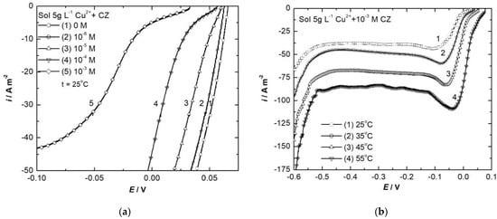LVs (Figure 4 and Figure 5) and correspondent Tafel plots [36] (Figures S1 and S2 presented in Supplementary Materials) have been drawn for Cu and for Ni electrode respectively in electrolyte solutions without and with different concentrations of CZ (between 10−6 and 10−3 mol L−1).