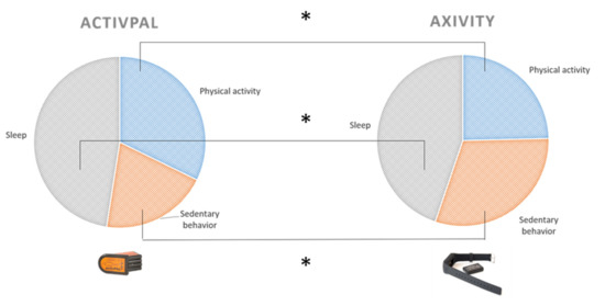Visual representation of the distribution of time in physical activity, sedentary behavior and sleep across 24 h measured with the ActivPAL on the one hand and the Axivity on the other hand. * Significant difference between ActivPAL and Axivity accelerometer (p < 0.01).