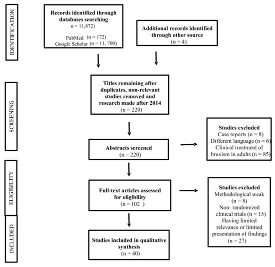 A literature review was performed based on a search in PubMed and Google Scholar databases for articles on SB in children and its causes, diagnosis, and treatment. The following keywords were used in the search to find relevant articles: “bruxism,” “children,” “etiology,” “diagnosis,” and “treatment” (in accordance with Medical Subject Headings). The search was filtered to include only papers published from 2014 to 2021, in both Polish and English language. A preselection of articles was made by reviewing their title and/or abstract, and those that did not meet the inclusion criteria were rejected. Two researchers then conducted an independent in-depth analysis of the remaining articles. The data extracted from the studies included study characteristics, participants, interventions, and results.
