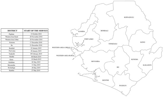 In line with recommendations issued by the World Health Organization (WHO), in 2013, the African Federation of Emergency Medicine advocated for the development of prehospital care systems to reduce the high morbidity and mortality rates reported in African countries [11,12]. Thus, in keeping with both WHO guidelines and national health security policies, in 2016, a government-backed joint venture comprising Doctors with Africa (CUAMM, Padua, Italy), the Regional Government of Veneto (Italy), the Research Center in Emergency and Disaster Medicine (CRIMEDIM, Università del Piemonte Orientale, Italy), and the Sierra Leone Ministry of Health and Sanitation (MOHS), designed the first National Emergency Medical Service (NEMS) in Sierra Leone, one of the very few coordinated, structured, and fully equipped prehospital emergency medical services (EMS) in the African continent [5,13,14]. The goal of this newly developed entity is to provide a free-of-charge prehospital service coordinated by a centralized operation center (OC), using part of the ambulances donated to the country during the Ebola outbreak [14]. With seed funding from the World Bank (Washington, DC USA), the service started in October 2018 and reached the full operativity countrywide on the 27th of May 2019, after a gradual process of training sessions and subsequent activation in all the 14 districts of Sierra Leone [14]. After a 26-month work plan, the joint venture released a fully staffed and functional NEMS working all over Sierra Leone, managed by the local MOHS staff and funded through the governmental budget.