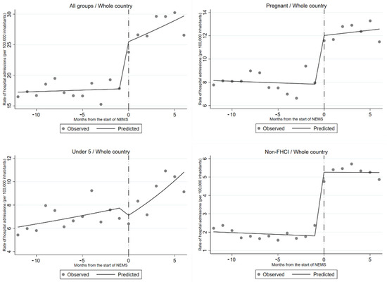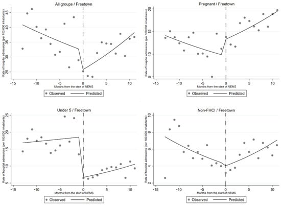 Observed and predicted hospital admission rates in Sierra Leone before and after the introduction of the NEMS. The results are also stratified by categories of the Free Health Care Initiative.