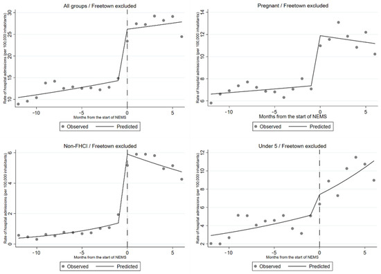 Observed and predicted hospital admission rates in Sierra Leone, with the exclusion of Freetown, before and after the introduction of NEMS. The results are also stratified by categories of the Free Health Care Initiative.