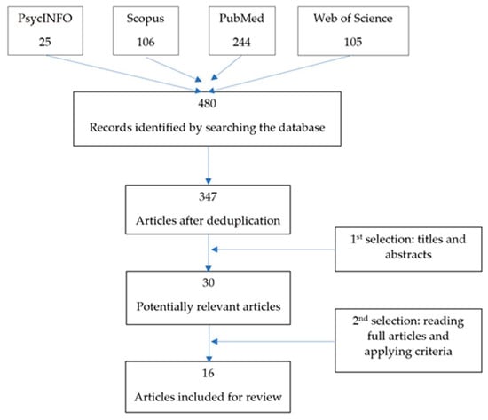 Our electronic searches identified 480 articles, which were reduced to 347 after deduplication. The first and last authors independently read the titles and abstracts of the 347 papers and selected articles meeting our inclusion and exclusion criteria. They compared their selections and came to an agreement on the two discordant articles, ultimately identifying a total of 30 articles. One other paper would have been eligible according to our criteria, but it was not available and the authors did not respond to our request for a copy []. The 30 articles were read by the first author and a second expert, who independently selected 16 to be analyzed in the next stage (two of these articles were included after a discussion between the two reviewers). The following inclusion and exclusion criteria were adopted to identify the final set of 16 articles.