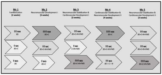 - 15 to 20 min of bioenergetics (by means of gait training sequences, rhythm exercises, or functional motor skills) on different days, depending on the periodized objectives.
