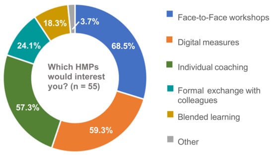 More than half of managers (61.6%, n = 109) considered their working conditions health-promoting and thought digital tools helped relieve their daily workload (55.4%, n = 97, see Figure 1). Similarly, the majority of managers (57.9%, n = 103) had not participated in HPMs before. Managers, who were asked if they wished to participate in HPMs more often (n = 83), mostly affirmed that wish (66.3%, n = 55). The remaining managers did not know (25.3%) or declined (8.4%). Across all HPM modes, managers who wished to participate in HPMs more often preferred face-to-face workshops (68.5%), digital measures (59.3%), and individual coaching (57.3%) (multiple response option). Respondents were less interested in formal exchange with colleagues, blended learning, or other HPM modes (see Figure 2).